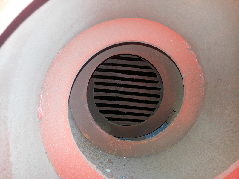 在球磨机端盖内表面和卸料篦板之间,形成一个环行空间,在端盖壁上切割椭圆形孔,物料从此孔卸出,落到外罩下部。